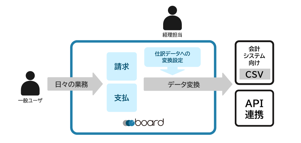 この仕組みにより、案件(見積書や請求書)を作成する現場の担当者は、会計連携を意識することなくboardを使うことができます。また、経理はその都度仕訳データを編集するのではなく、初めに1回設定するだけで、意図した通りの仕訳データを出力することができます。