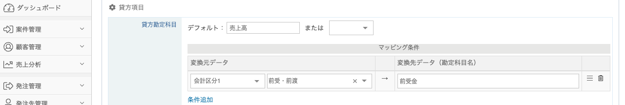 条件として使用するのは、案件区分、会計区分などの項目です。案件区分は売上分析の集計軸が主な用途ですが、会計連携の条件としても活用できます。会計区分は、会計連携時の設定にのみ使用するものです。基本的には、案件区分だけでも十分に設定できますが、会計連携で使用したい区分が既存の案件区分とずれる場合など、経理側が独自の区分を設定できるように用意されているのが会計区分です。